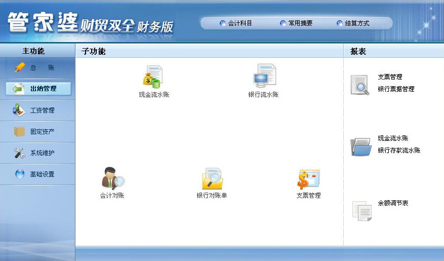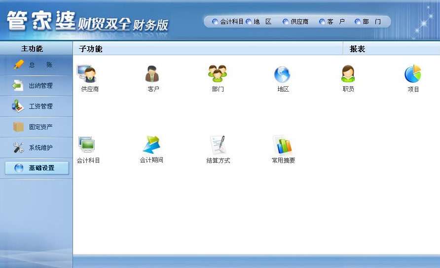 提供规范的会计核算凭证帐表以及客户、供应商、部门、个人、项目等辅助核算,满足企业财务精细化管理的要求。全面支持新会计准则。